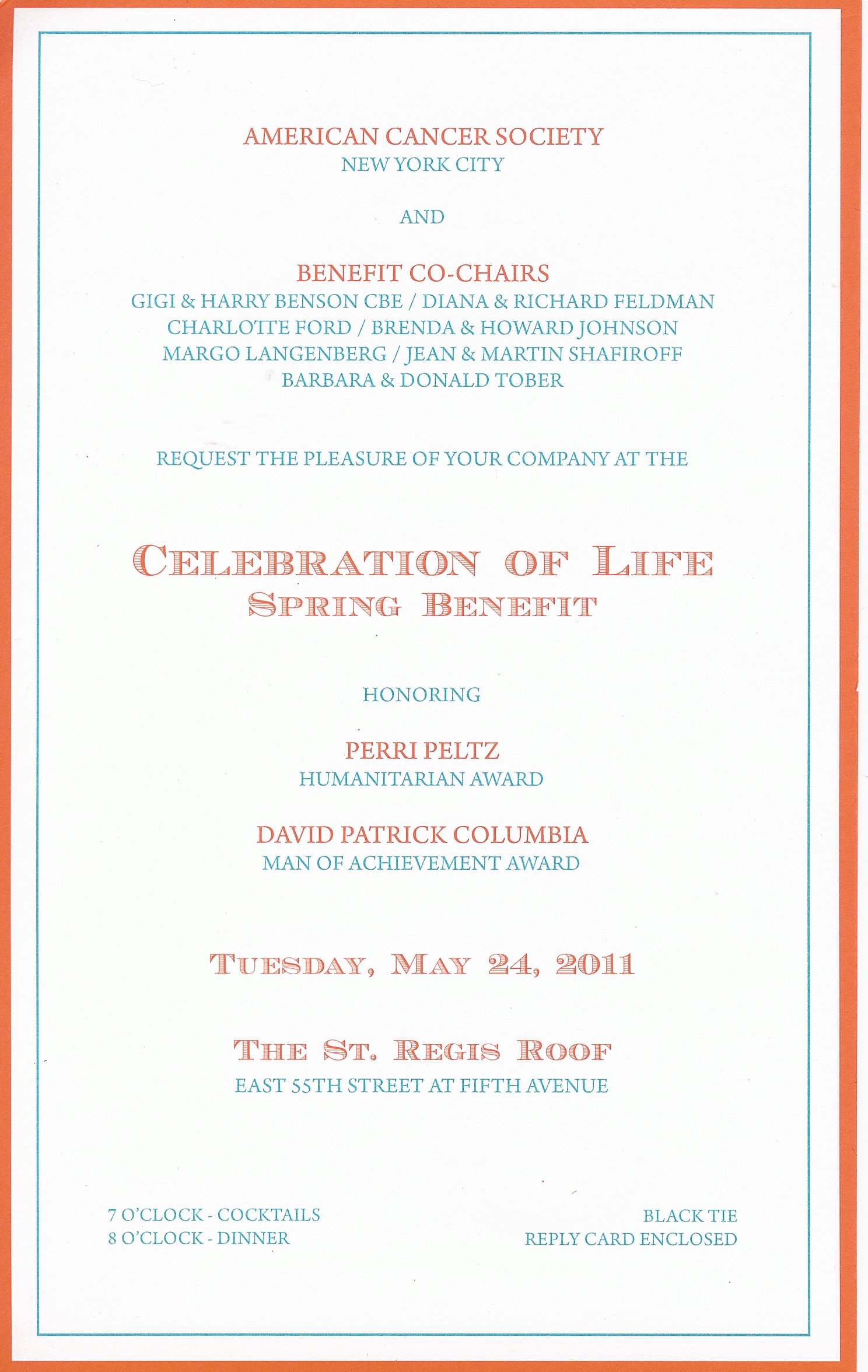 A Celebration of Life is The American Cancer Society Spring Benefit. What could be more glamorous than a Black Tie Gala on The St. Regis Roof! This year’s soiree honors a dynamic New York duo, Perri Peltz, distinguished TV news journalist, documentary film director and philanthropist and David Patrick Columbia, the founder and editor of New York Social Diary and a generous fixture in philanthropic circles. Paul Zahn will be keeping in lively as Master of Ceremonies as will the music and dancing to the Kit McClure All-Girl Band. Proceeds from the dinner and silent auction will help support American Cancer Society initiatives and services for cancer patients and their families, including Hope Lodge New York City, which provides free temporary lodging for cancer patients and their caregivers while undergoing treatments. For information, please visit The American Cancer Society.