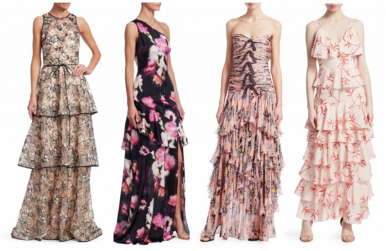 gowns from left: Theia Triple Flounce Cord Embroidered Maxi $995 / Theia One-Shoulder Floral $695 / Cinq  Sept Emira Strapless $1295 / Borgo De Nor Filipa Tiered $1533