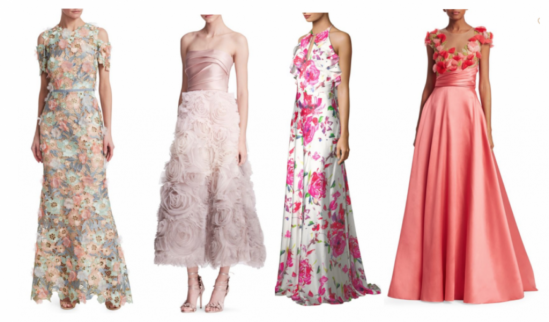 Galas and Formal Weddings at this time of year are so festive and feminine. We pare and bare down to the basic tenants of elegant dressing. Ditch the coat and the shawl and let your inner garden nymph go! While shopping at SAKS.com, we spotted two fabulous trends in Formal Attire. The first one is floral, which goes without saying, is taking over fashion right now, but the other one that we stumbled upon is floral AND flounce. The top row has softest chiffon in diaphanous layers or tiers. These are beautiful examples of a femininity that is so flattering and fun to wear. Picture yourself swirling and swaying over the dance floor tight in the arms of a handsome stranger husband!