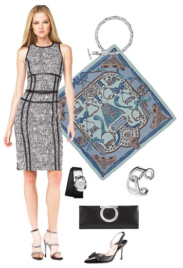 Dress: Michael Kors, Jewelry: Hermes, Cashmere Wrap: Hermes, Watch: Michael Kors, Clutch: Ferragamo, Shoes: Manolo Blahnik . To purchase please contact Mitchells/Richards department store.