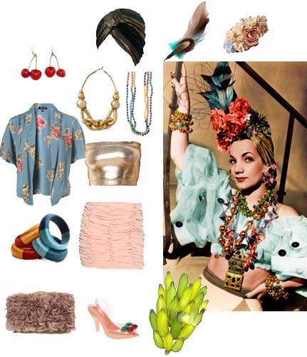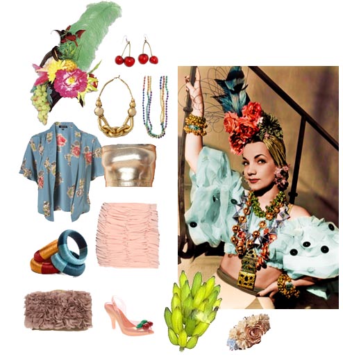 On Saturday October 30, Soho House New York is throwing a Carnivale-themed Halloween Party and we thought we would channel a Chiquita-esque Carmen Miranda costume. The Brazilian born Hollywood actress was best known in the 1940s for her fruit hat which we conveyed with a bit of faux fruit such as cherry earrings and these oh-so-fun Vivienne Westwood heels and even a bunch of bananas. Sass it up in some samba style with this gold tube top, ruched skirt and a Hawaiian fabric bolero. Complete the look with a feathered headpiece, and floral accessories like this clip and this ruffled clutch. Don’t forget your jewels! As you can see Miranda always piled on the necklaces and bangles– mix it up with a bit of gold and lots of color.