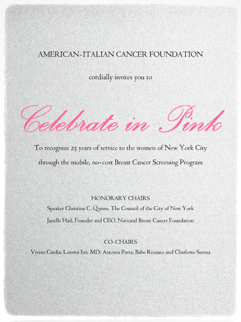 Breast cancer is an issue that will always be near to our hearts, so anytime a related cause is recognized, we make sure to show our support. This Thursday, June 14 from 6pm to 9pm at Espace, the American-Italian Cancer Foundation invites you to Celebrate in Pink with cocktails, hors d’oeuvres, wine tasting, silent auction, DJ, and raffle to recognize 25 years of the mobile, no-cost Breast Screening Program in NYC, which has saved countless lives over the years. The Honorary Chairs of the event are Speaker Christine C. Quinn of The Council of the City of New York, and Janelle Hail, Founder and CEO of the National Breast Cancer Foundation in Texas. The wonderful and dedicated Co-Chairs are Vivian Cardia, Loretta Itri, MD, Charlotte Serena, Antonia Pavia and Babe Rizzuto. Email Colleen Cashman at ColleenCashman@americanitaliancancer.org or call her at 212-628-9090 for more information about this wonderful cause, and click here to purchase tickets!