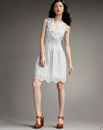 Ah eyelet – just the sound bring back happy memories of simple summers long past, and of little girls dressing up for star-lit nights of chasing fire flies. It is still as fresh and crisp today as it was back then. So, feeling a bit nostalgic, we went shopping for an updated eyelet look for summer and fell in love with this Marc Jacob scalloped silhouette that is so feminine and flattering – simply perfect for all of summer’s special events.