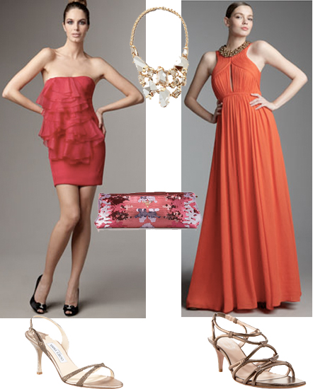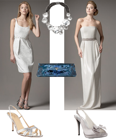 Left to Right: Carmen Marc Valvo Brocade Veaded-Waist Dress ($565), Kate Spade Covet Too Posted Slingback Sandal ($325), Vera Wang Big Crystal & Chain Necklace ($795), Prada Pailettes Clutch ($995), Carmen Marc Valvo Metallic Tweed Gown ($1025), Stuart Weitzman Satin Bow Peep-Toe Slingback Pump ($335)