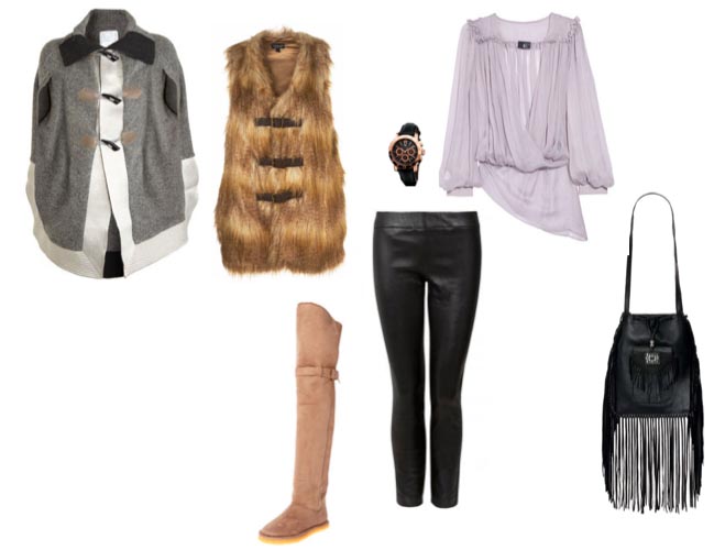 Left to Right: Sacai Toggle Cape ($995), Topshop Vest ($160), Stella McCartney Boots ($625), Bulgari Watch, The Row Leather Cropped Leggings ($1, 760), Just Cavalli Top ($555), Genvieve Jones Bag