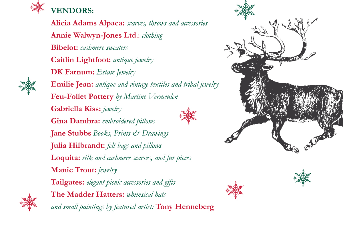 We have planned a wonderful day in the country to celebrate the holidays and have picked a warm and stylish outfit for the adventure. It includes Holiday Trunk Shows with unique gifts for everyone on your list, lunch at Stissing House, a cosy country inn and picking out your Christmas tree to be freshly cut on the spot. You will be traveling on the most beautiful roads in Duchess County, so we have included a map and instructions below to help you navigate. What a lovely way to do all of your Holiday Shopping in a relaxed atmosphere where you will be meeting wonderful artists and artisans who created the one-of-a-kind pieces like Alicia Adams of Alicia Adams Alpacas and Emilie Jean’s collection of antique and vintage textiles and tribal jewelry.