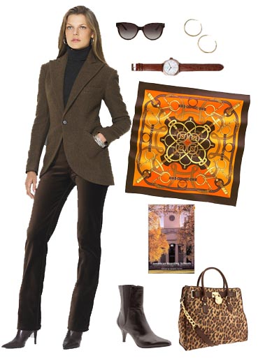 Left to Right: Ralph Lauren Tweed Jacket ($290), J.Crew Black Turtleneck ($68), Ralph Lauren Corduroy Trousers ($245), Marc Jacobs Retro Sunglasses ($98), Gorjana Hoops ($54), La Mer Oversized Vintage-Style Watch ($88), Hermes d’Or Scarf ($375), Celeste Hester’s “American Boarding Schools” ($11.42), Brown Boots ($119), Micheal Kors Bag ($348)