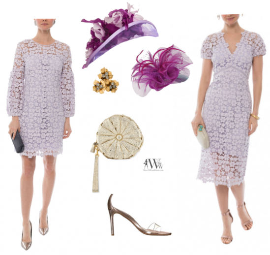 dresses: Shoshanna Vina Lilac Lace $418 / Shoshanna Paulina Lilac Lace $404 hats: Christine A.Moore Iris Queen – Parisisol Big Brim Hat $815 / Swan Belinda-Headband Fascinator $59 accessories: Anya Hindmarch Pillow Layered Metallic Clutch Bag $575 / Jennifer Behr Maye Earrings $128 shoe: Manolo Blachnik Estro Fabric & Pvc Ankle-Wrap $745