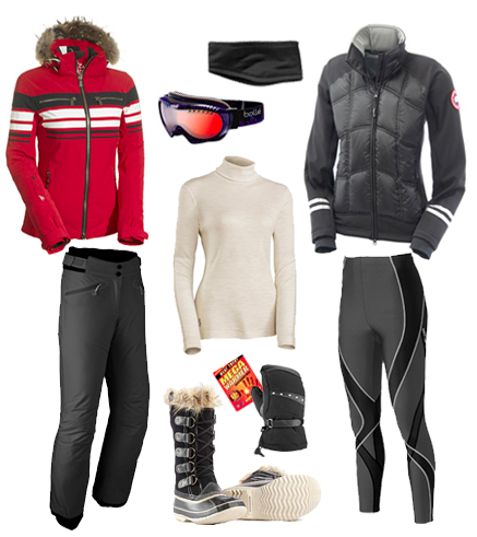 Ski Look clockwise from left: Toni Sailer Jeneil Ski Jacket ($1,060), Bolle Simmer Goggle ($79.95), Patagonia Headband ($25), Canada Goose Hybridge Jacket ($475), CW-X Insulator Tights ($109.95), Sorel Joan of Arctic Boots ($130), Eider Catina Ski Pants ($229.95), Smartwool Turtleneck ($79.95), Megawarmer Hand Warmers ($1.50), Kombi Charlotte Mittens ($69.95)