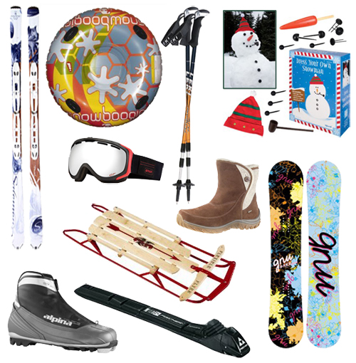 Top to Bottom: Salomon Origins Pearl Skis ($600),Whamo Mondo Snow Tube ($28), Leki Thermolite Antishock Trekking Pole ($140), Snowman Building Kit ($12), Anon Hawkeye Snow Goggles ($125), Patagonia Snap Waterproof Boot ($120), Flexible Flyer 48″ Sled ($76), Alpina Sports Boot ($140), Fisher Profil Auto ($45), GNU B-Nice Floral Snowboard ($400),