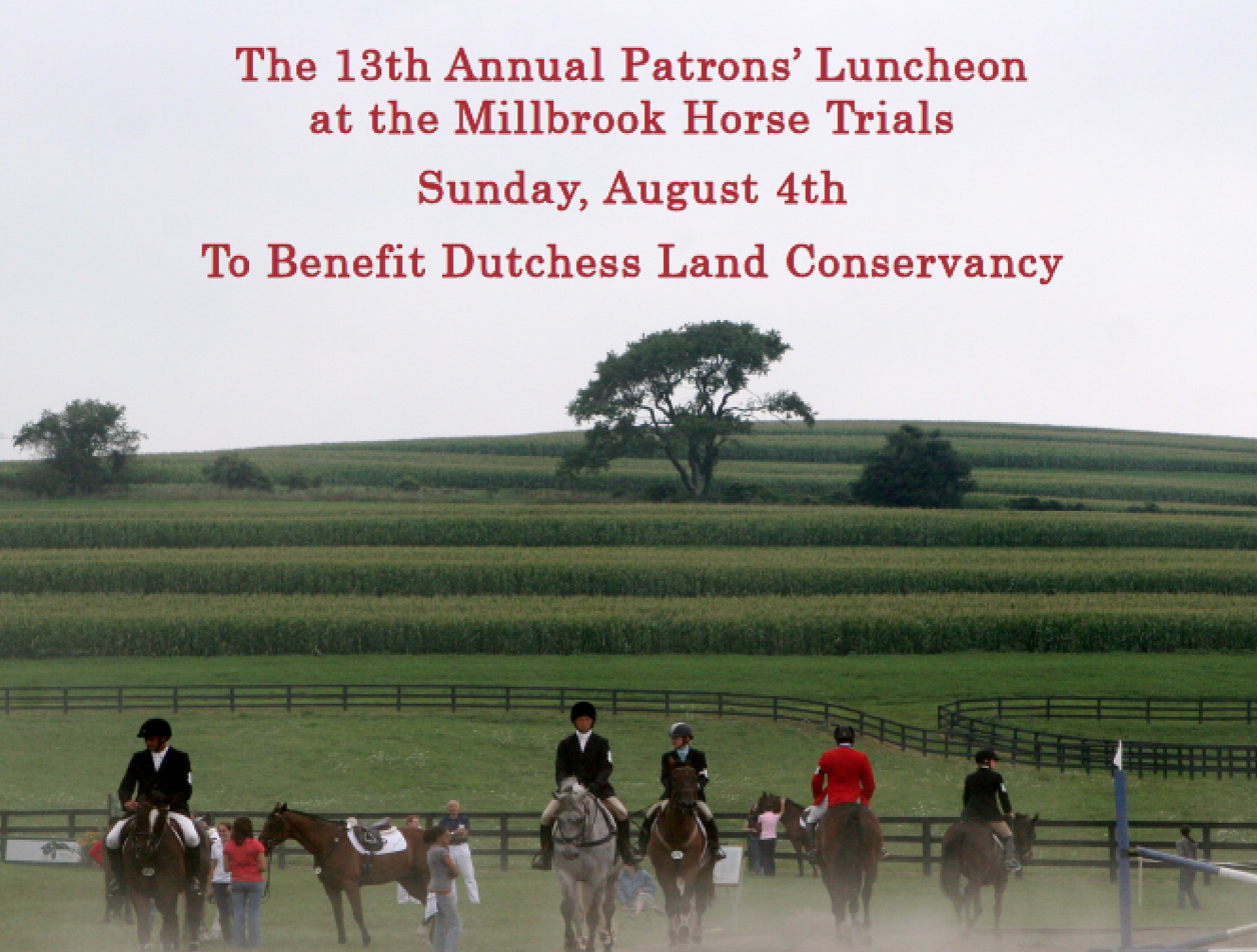 Enjoy a beautiful day in the pastoral Millbrook Countryside at the Dutchess Land Conservancy Patrons’ Luncheon at the Millbrook Horse Trials on Sunday, August 4th, Noon-2 pm. The elegant Chairs Lisa Barnes Schwartz and Kat Kennan have created a wonderful event in the Patrons’ Tent overlooking the Stadium Jumping Competition as World Class Riders complete the final leg of the Horse Trials. For tickets and for more information, please call 845-677-3002.