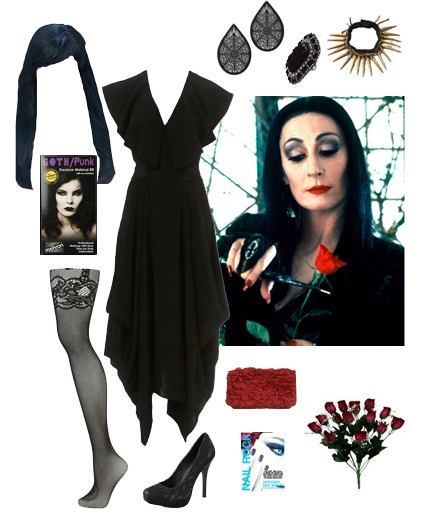 We all like to get a little kooky on Halloween and none is creepier than the matriarch of the Addams family, Morticia Addams. Her vampish looks complete with pale skin and long black hair are totally fun to mimic. She loves to seduce her husband, Gomez Addams, by speaking french and can be found snipping the buds off of roses and arranging the stems in vases around their spooky mansion. Simply slip on this neck plunging dress, black wig, sexy thigh-high fish-nets and black lace pumps to get into the goth mode. We added some cobweb-like lace jewelry and a spiked bracelet with a rose petal clutch. Wednesday Addams claims that Morticia wears baking powder for make-up yet we threw in a Goth/Punk make-up kit with black lace nail stickers to complete the look. Don’t forget your pruning scissors to deadhead this “pleasant” bouquet of roses.