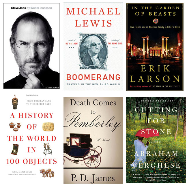 CLICK TO PURCHASE: Steve Jobs ($17.49), Boomerang: Travels in the New Third World ($15.34), In the Garden of Beasts: Love, Terror & an American Family in Hitler’s Berlin ($13.49), A History of the World in 100 Objects ($26.90), Death Comes to Pemberley ($15.57), Cutting for Stone ($9.57)