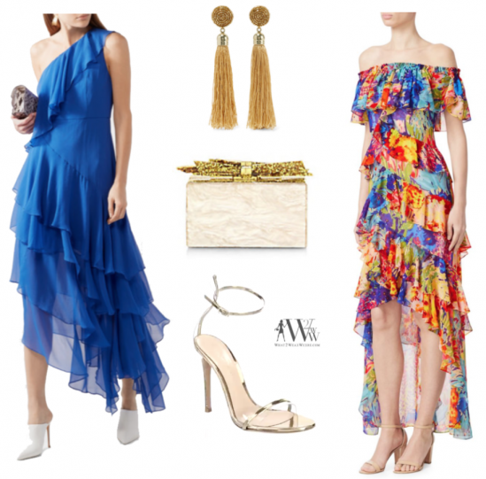For what to wear, we went shopping for something as vibrant and graceful and Mr. Robbins himself and a look that would swing and sway the evening away. We were drawn to the bright shades and ruffled silhouette of these two gowns while paring with simple and elegant accessories.
