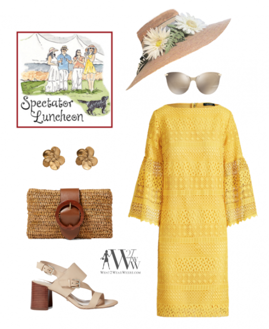 dress: Ralph Lauren Lace Bell-Sleeve Dres $195 hat: The Madder Hatter accessories: Polo Ralph Lauren Raffia Lennox Clutch SALE $84.99 / Ralph Lauren Square-Bridge Sunglasses $225 shoes: Ralph Lauren Florin Vachetta Leather Sandal SALE $69.99