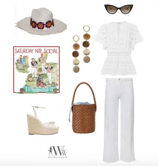 tops: Sea Lla Lace Blouse $350 pants: L’Agence Danica Wide leg Cropped Jeans $255 accessories: Sunday Somewhere Piper Sunglasses $250 / Agento Vivo Horn Layered Earrings $78 / Loeffler Randal Cleo Striped Insert woven Basket $350 shoes: Schutz Gianni Wedges $200 hat: Glamourpuss Nyc Sequin Cowboy $235