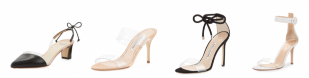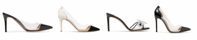 from left to right: Gianvito Rossi Plexi Patent Mules $695 / Gianvito Rossi Specator Pumps $795 also available in black / Jimmy Choo Saskia Embellished Mule $825. /