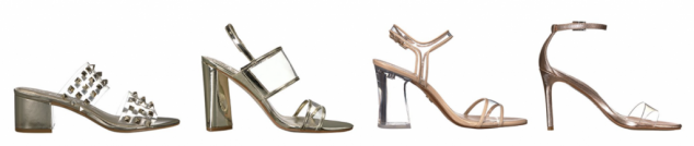 from left to right: Katy Perry The Kenzie $109 available in four shades / Guess Amidala SALE $62 available in gold and black / Michael Kors Tori Sandal $135 / Charles By Charles David Cristal $109 available in three shades /