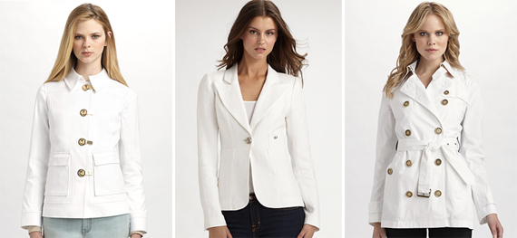 Finally (almost) summer and we all are wearing white again. We tend to follow the Memorial Day to Labor Day rule of thumb for style – it makes it feel so special, and well worth the wait. We love the crispness of all-white dressing, especially with a little tan. We went shopping at SAKS.com to find our favorites of the season. The DKNY embroidered top and pants create a look that can go anywhere, dressed up or down. Until it gets a little warmer, why not travel with one of these great white summer jackets. Cocktail party in town or country, zip up a Little White Dress LWD and feel that cool summer style coming on.